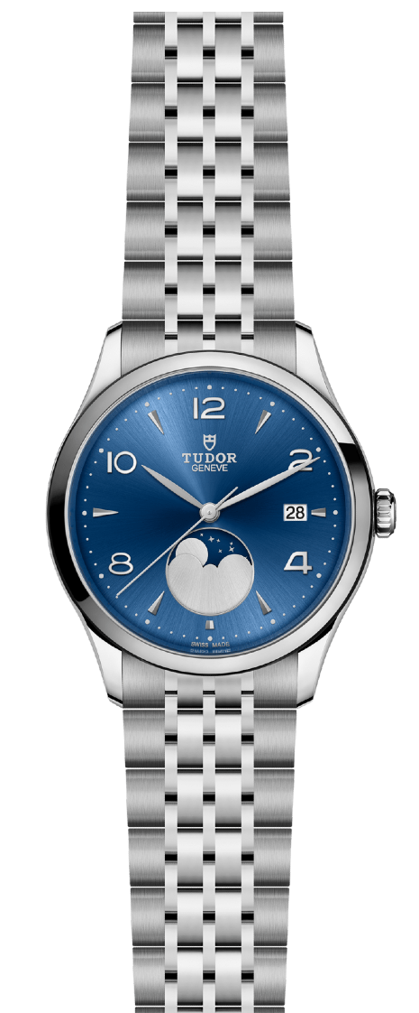 Blue satin sun-brushed dial with applied numerals and moon phase indicator
